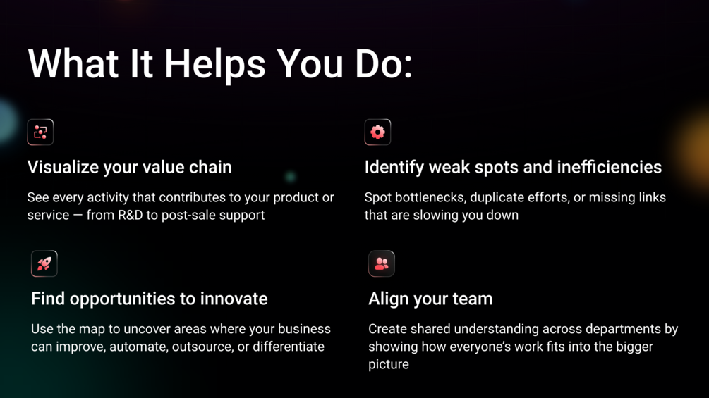 With the Value Chain Architect, you’ll gain clarity on where your business creates value — and how to create even more of it.